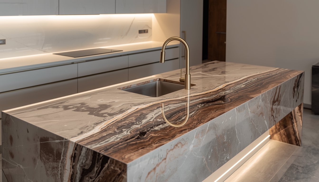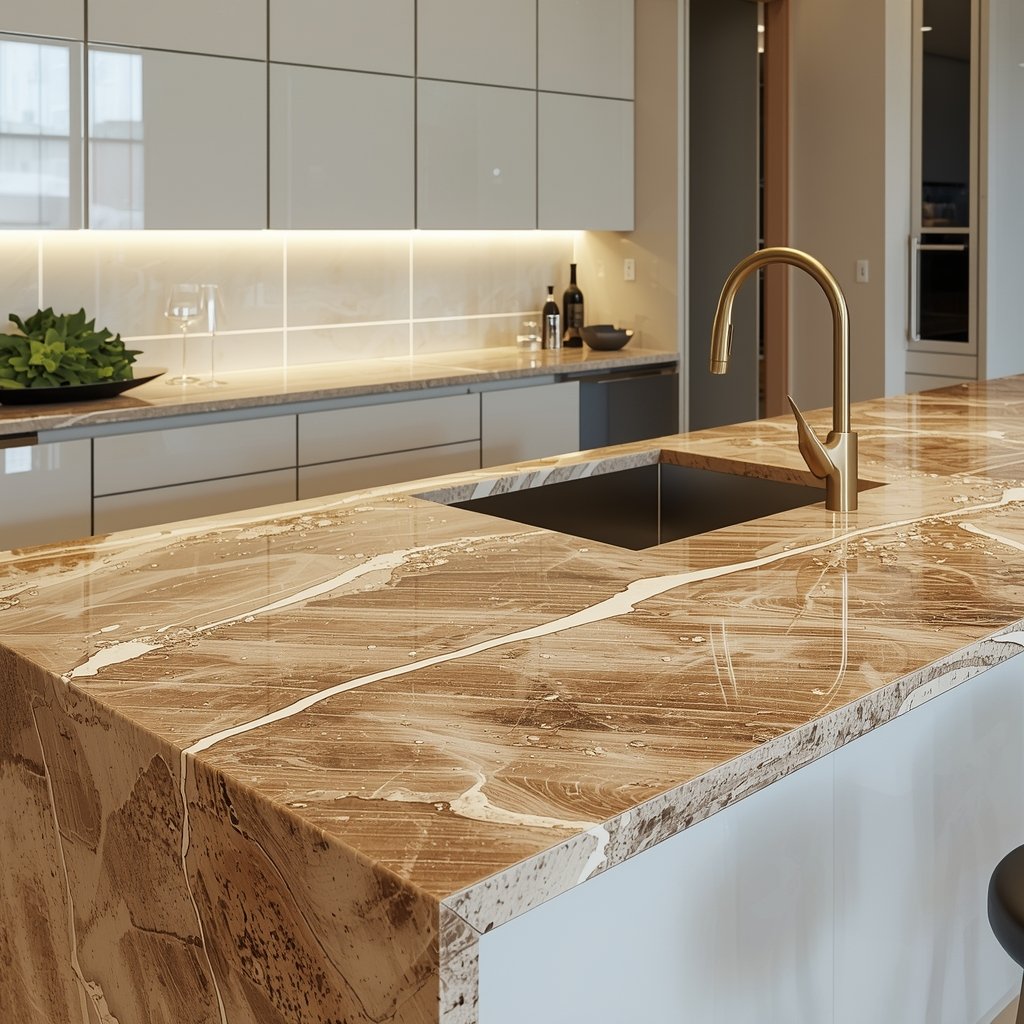 A self leveling epoxy resin countertop system is poured and shaped. Marble, metallic, or custom finishes are created during this stage.